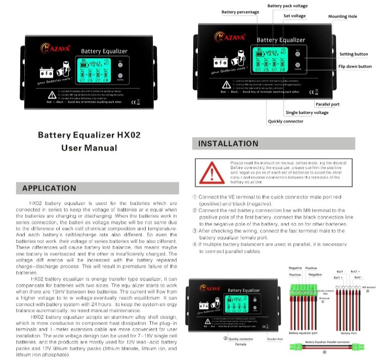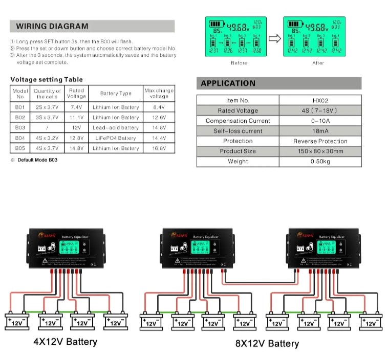 4S4P 24V 36V 48V kada su baterije spojene serijski i pune se, prazne ili čak samo stoje napon između tih baterija može da postane različit što može dovesti do oštećenja baterije ali balanser će detektovati kada razlika između baterija nastane i nivelisati je. HX02 podržava sledeće hemije Gel AGM Olovo Li-Ion LiFePO4 do 48V, sa maks. balans strujom do 10A!