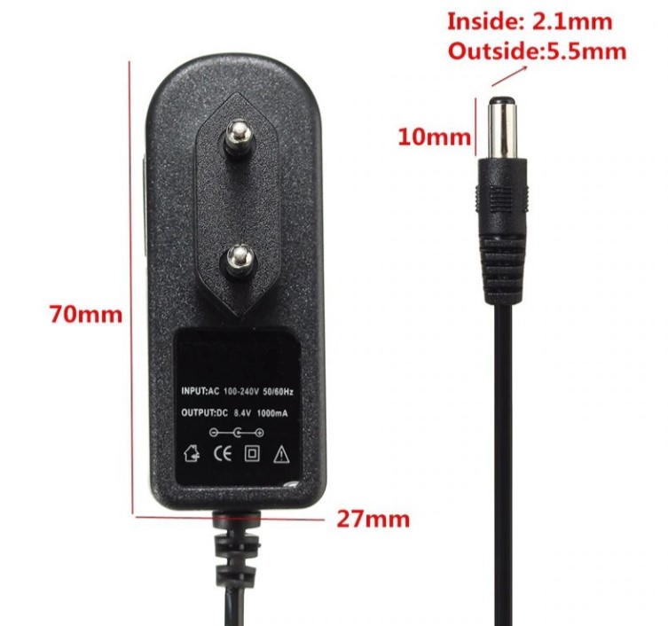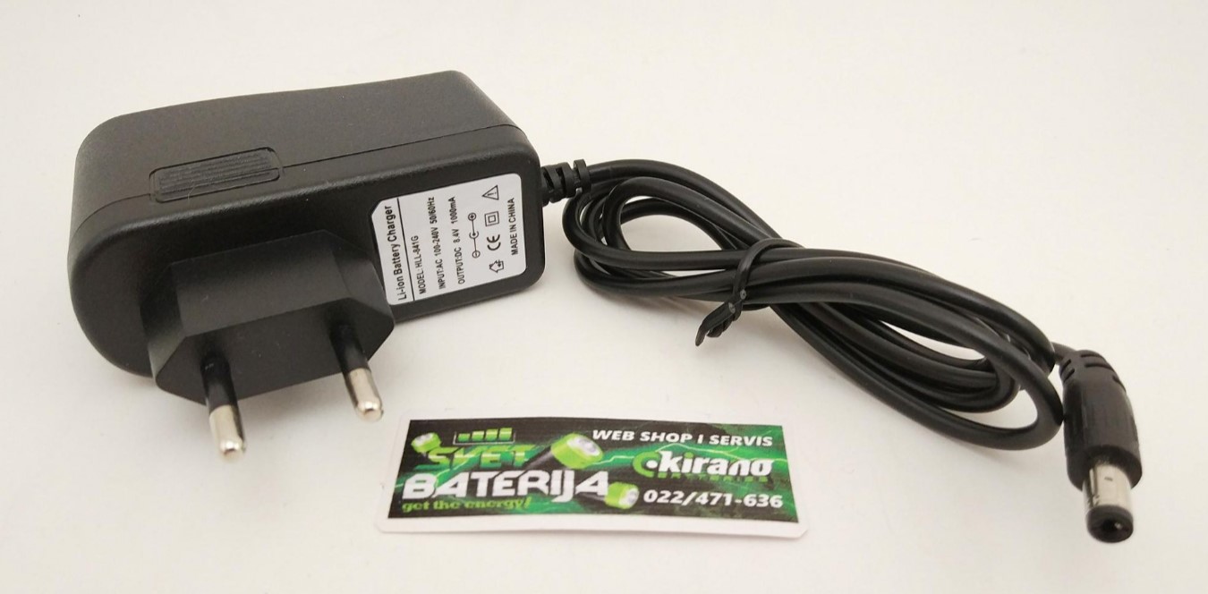 Punjač namenjen za punjenje litijum jon 2S paketa baterija sa nominalnim naponom 7.4V 7.2V i puni sa maksimalnom strujom 1000mA, dimenzija konektora standardna 5.5x2.1mm. Punjač je nov i nekorišten, namenjen je isključivo za Li-ion i Li-Po baterije!