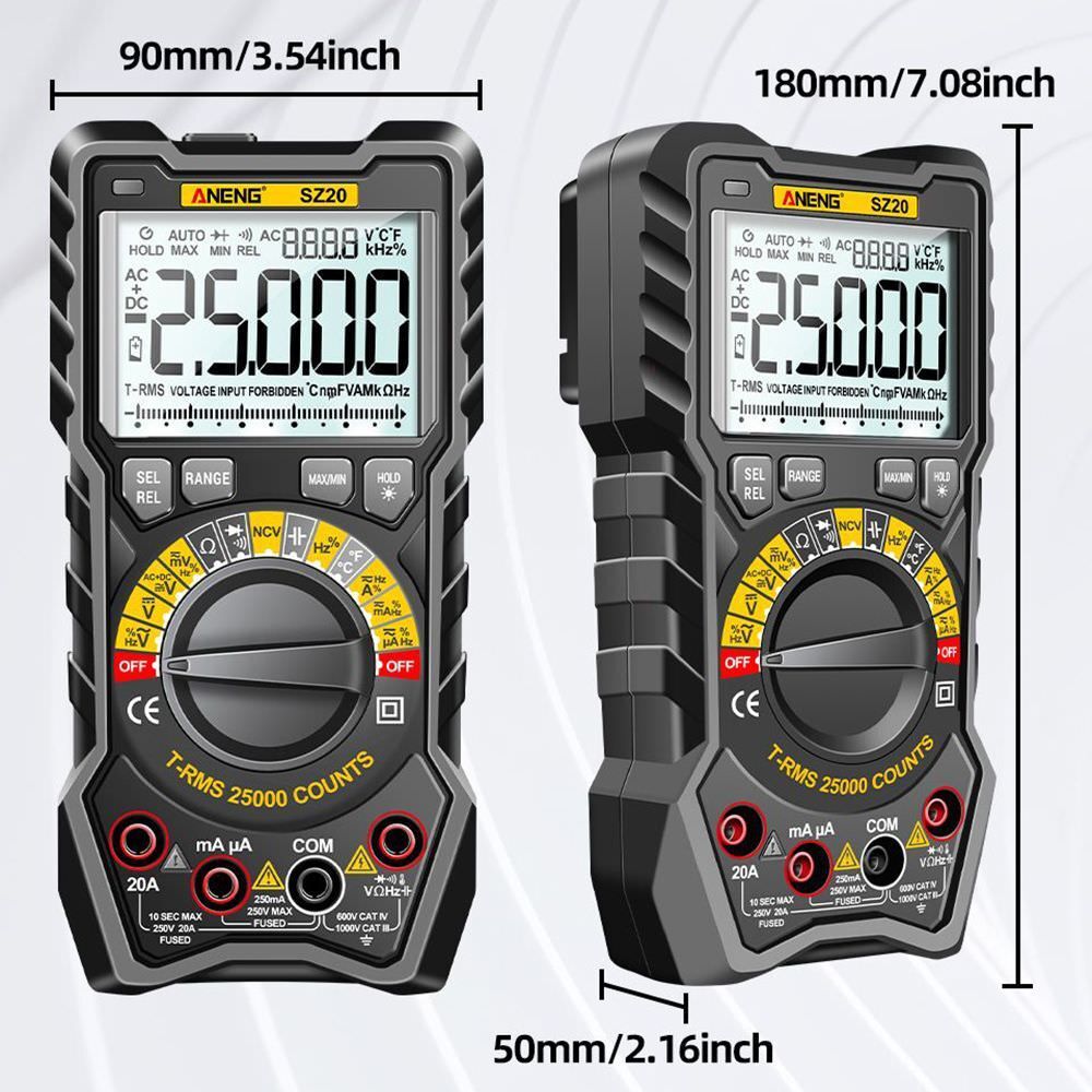 ANENG SZ20 vrhunski digitalni unimer sa True RMS podrškom tj automatskih rasponom merenja, sposoban da meri AC/DC napon, AC/DC struju, otpor, farade, frekvenciju i temperaturu a pored toga se ističe i sa NCV beskontaktnom detekcijom napona u kablu ili zidu, zujalicom tj testom provodnosti i testom diode. Pogodan kako za početnike tako i za profesionalce, savršen za servise elektronike i bele tehnike!