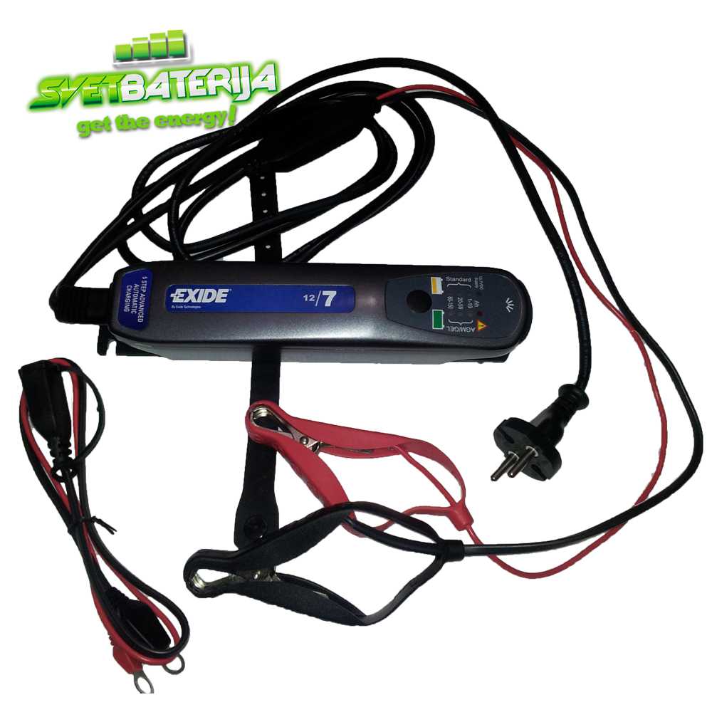 Profesionalni punjač olovnih baterija AGM, Gel i akumulatora stop-start od 12V, struja punjenja od 0.8A do 7A, marke Exide je uređaj karakterisan kvalitetom, pouzdanošću. Punjač Exide 12V 7A, podržava baterije sa visokim kapacitetima do 150Ah. Punjač radi po automatskom sistemu bez potrebe za nadzorom. Integrisani su brojni sistemi bezbednosti, senzor za temperaturu za optimalno punjenje kao i lampa za rad u mračnom prostoru. Moguće je i testirati bateriju pre punjenja pomoću ovog aparata. Uz punjač se dobijaju dodatni kablovi za fiksno povezivanje na akumulator, a dužina naponskih kablova iznosi oko 1.7 metara.