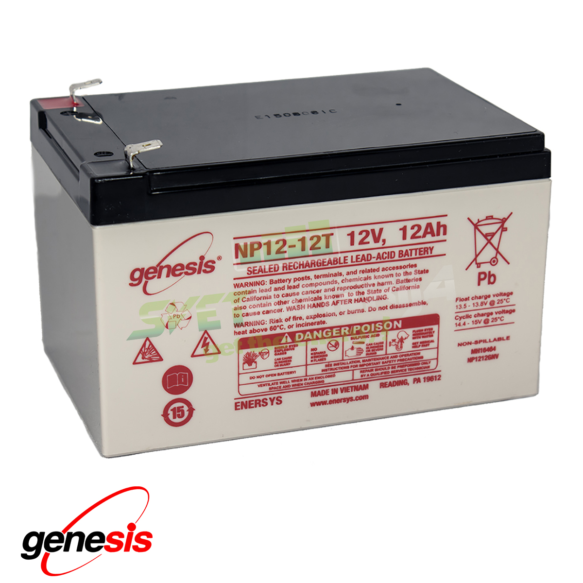 Koristeći najnovije tehnologije kompanija EnerSys (bivša Yuasa) su primenili svoje dugogodišnje iskustvo u polju olovno-kiselinskih baterija kako bi dizajnirali optimalni proizvod zapečaćenih olovno-kiselinskih baterija. Jedinstvena tehnologija konstrukcije ovih baterija sprečava bilo kakvo curenje elektrolita iz kućista ili terminala. Genesis SLA baterija 12V 12Ah oznake NP12-12 je punjiva olovna baterija bez tečnog elektrolita što u potpunosti eliminiše potrebu za održavanjem. Zahvaljujući visokoj gustini energije, Genesis olovne baterije su idealne za UPS uređaje, dečije igračke, osvetljenja, sisteme za obezbeđenje, kosačice, električne alate kao i razne merne uređaje.