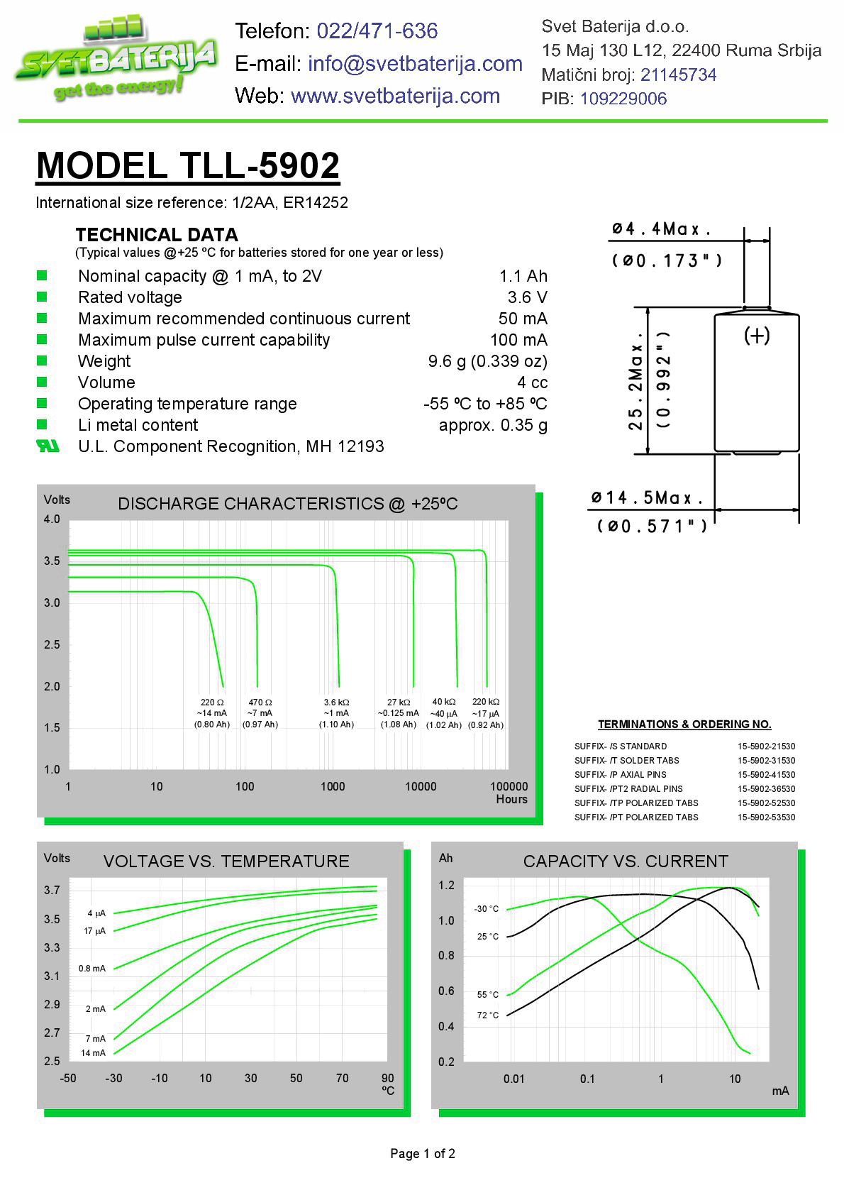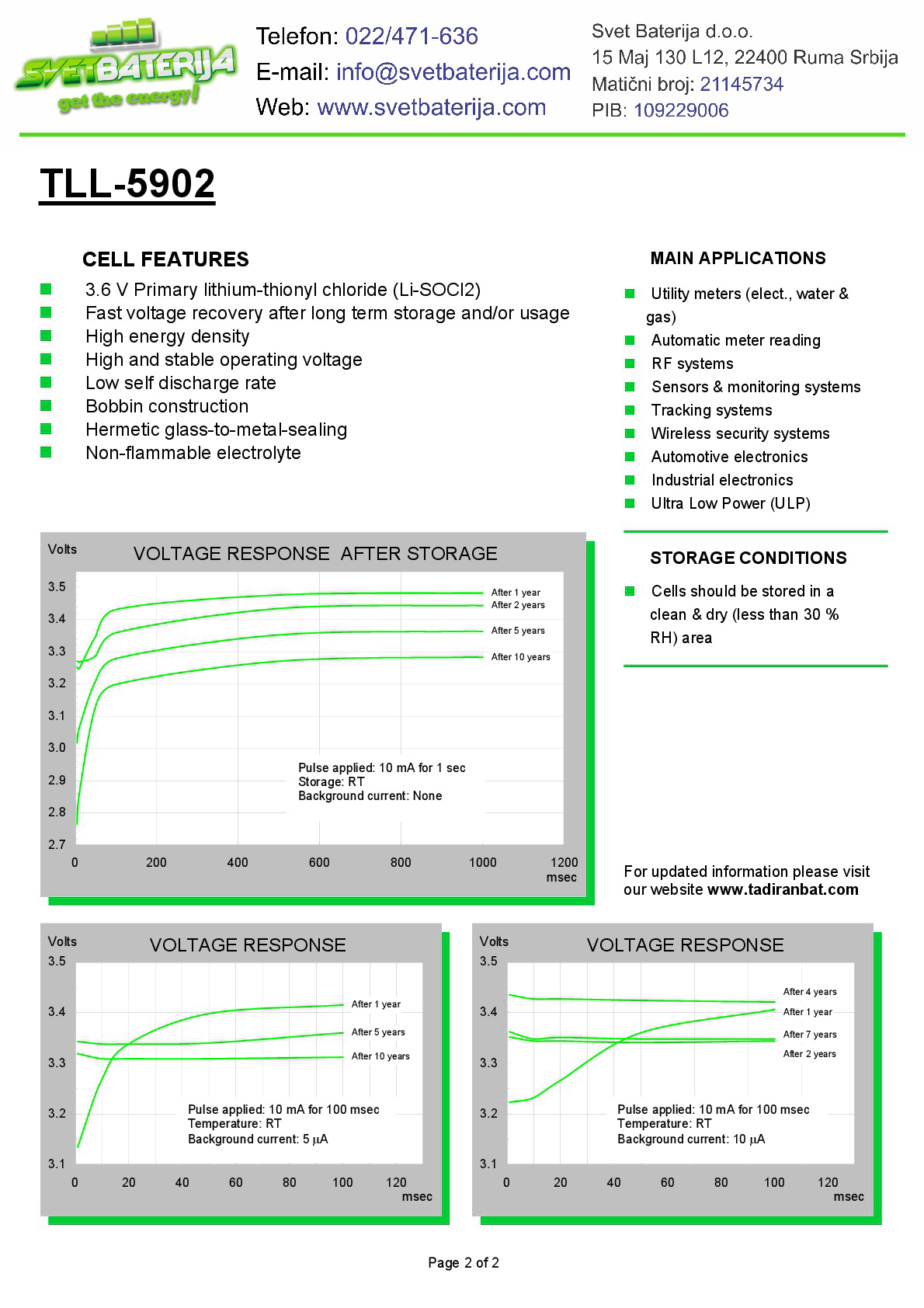 VAŽNO: Tadiran TL-5902/TP je PRIMARNA baterija i nije punjiva. Ni pod kakvim okolnostima je nemojte puniti. Kada je potpuno ispraznite molimo vas da je odložite po propisima odlaganja opasnog materijala ili je predajte u neki od naših reciklažnih centara.