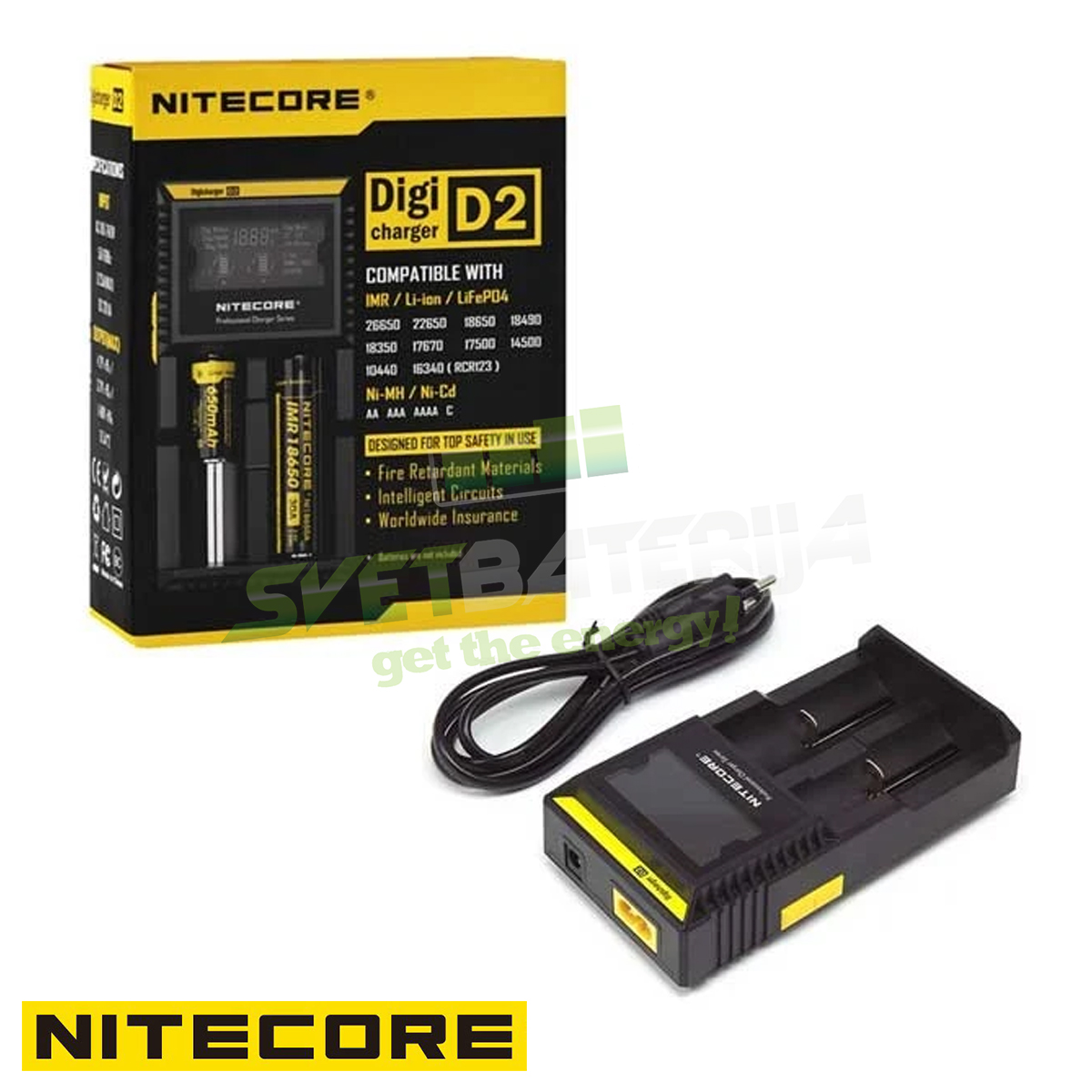 NITECORE D2 je univerzalni punjač koji podržava skoro sve cilindrične punjive baterije, što znači da nema više potrebe za gomilom punjača za različite dimenzije i hemije baterija. D2 automatski prepoznaje Li-Ion (Litijum Jon), Ni-Mh (Nikl Metal Hidrid), Ni-Cd (Nikl Kadmijum) baterije ali uz ručno podešavanje moguće je punjenje i Li-Fe-Po4 ( LiFePo4, Litijum Gvožđe Fosfat ) baterija. Odlična izrada elektronike koja automatski podešava napon punjenja za svako ležište zasebno, što ga čini idealnim za svakog kupca bilo to početnik ili iskusni korisnik. Odličan prikaz statusa punjenja, napona, struje i vremena daje širok LCD displej. Još jedna karakteristika koja omogućava još lakše punjenje je ta da nakon završetka punjenja baterije punjač automatski prekida punjenje na tom ležištu.
