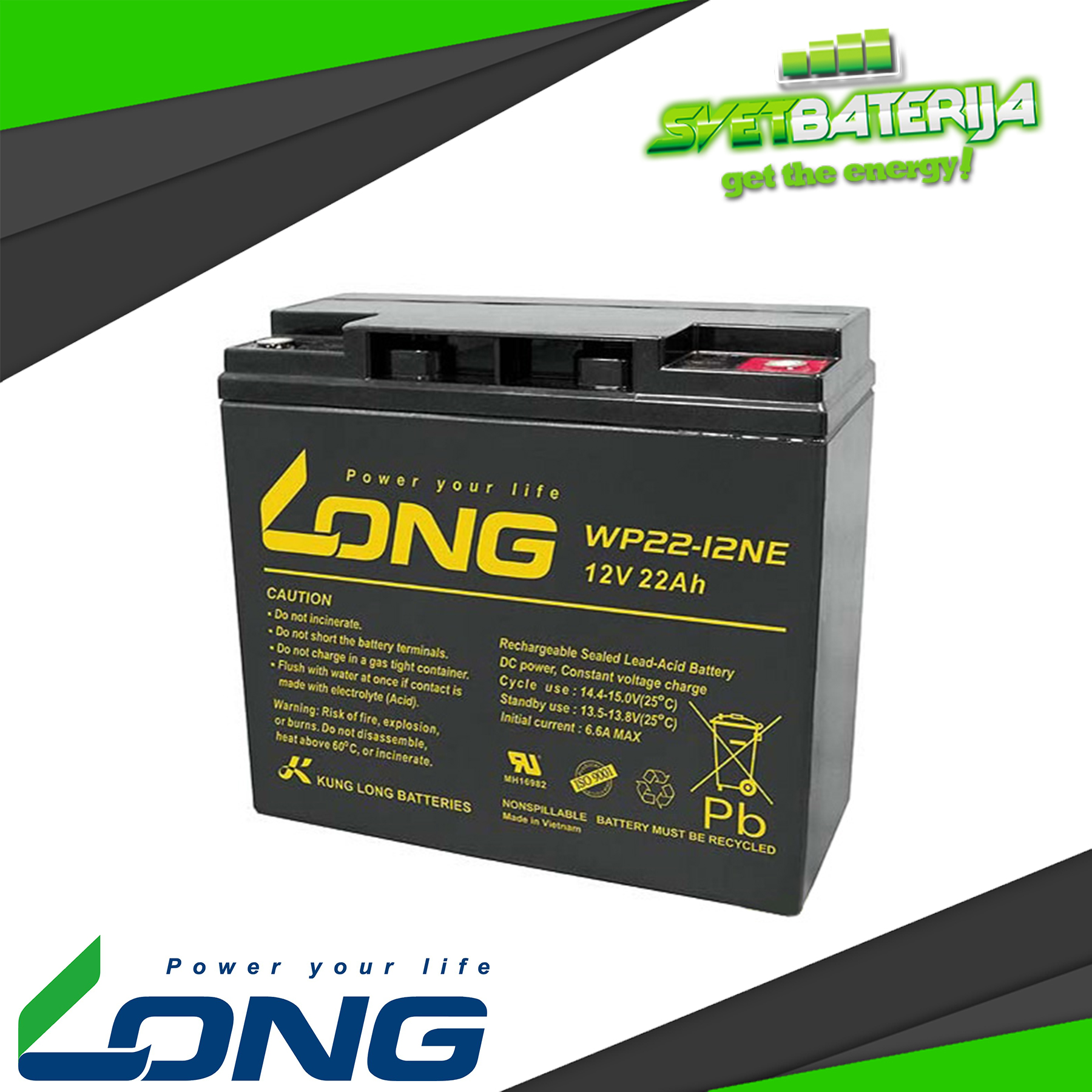 Kompanija Kung Long Batteries se bavi proizvodnjom i prodajom olovnih baterija na Tajvanu. Njihovi proizvodi obuhvataju AGM i Gel baterije, kao i druge tipove duboko cikličnih baterija. Long baterija 12V 22Ah pod oznakom WP22-12NE je specijalna baterija dimenzija 181x76x167 mm, koja za razliku od drugih baterija ovog napona i kapaciteta može da obezbedi veće struje pražnjenja. Ova baterija obezbeđuje i dug životni vek u uređajima kao što su alarmne centrale, reflektori, prskalice, kosačice, lampe i druge uređaje gde se traži suva baterija sličnih dimenzija ili karakteristika. Pored garancije od 12 meseci ističe se najbolji odnos cene i kvaliteta!