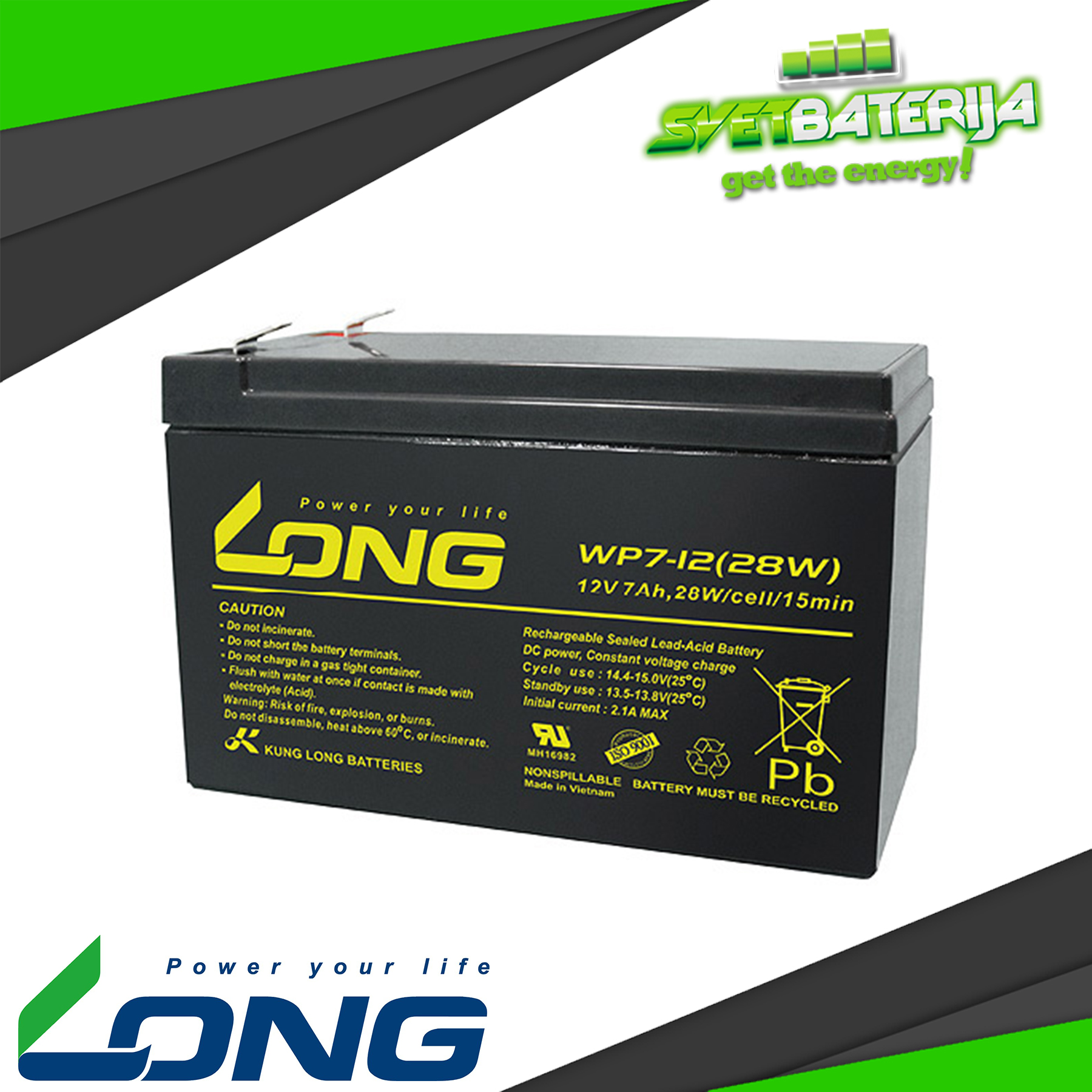 Kompanija Kung Long Batteries se bavi proizvodnjom i prodajom olovnih baterija poreklom iz Tajvana. Njihovi proizvodi obuhvataju AGM i Gel baterije, kao i druge tipove duboko cikličnih baterija. Long baterija 12V 7Ah pod oznakom WP7-12(28W) je specijalna baterija dimenzija 151x65x94 (102 totalna visina) mm, koja za razliku od drugih baterija ovog napona i kapaciteta može da obezbedi veće struje pražnjenja. Idealna za primenu u UPS uređajima. Ova baterija obezbeđuje i dug životni vek u uređajima kao što su alarmne centrale, čobanice (pastirice), dečije igračke, prskalice, kosačice, lampe i druge uređaje gde se traži suva baterija sličnih dimenzija ili karakteristika.