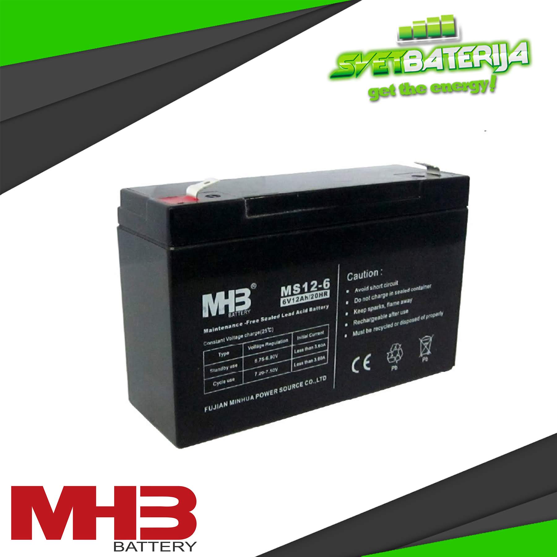 Kompanija MHB Batteries je poreklom iz Kine i bavi se proizvodnjom i prodajom olovnih baterija. Vodeći su proizvođači ćelijskih panela za baterije a njihovi proizvodi obuhvataju AGM i Gel kao i druge tipove duboko cikličnih baterija. MHB baterija 6V 12Ah je specijalna baterija dimenzija 151x50x94 (100 totalna visina) mm, koja za razliku od drugih baterija ovog napona i kapaciteta može da obezbedi veće struje pražnjenja. Višenamenska baterija, idealna za UPS uređaje, aparate za medicinu, signalizirajuća svetla, alarm sisteme za obezbeđenje, sisteme za telekomunikaciju, igračke i druge uređaje gde je potrebna suva baterija sličnih dimenzija ili karakteristika.