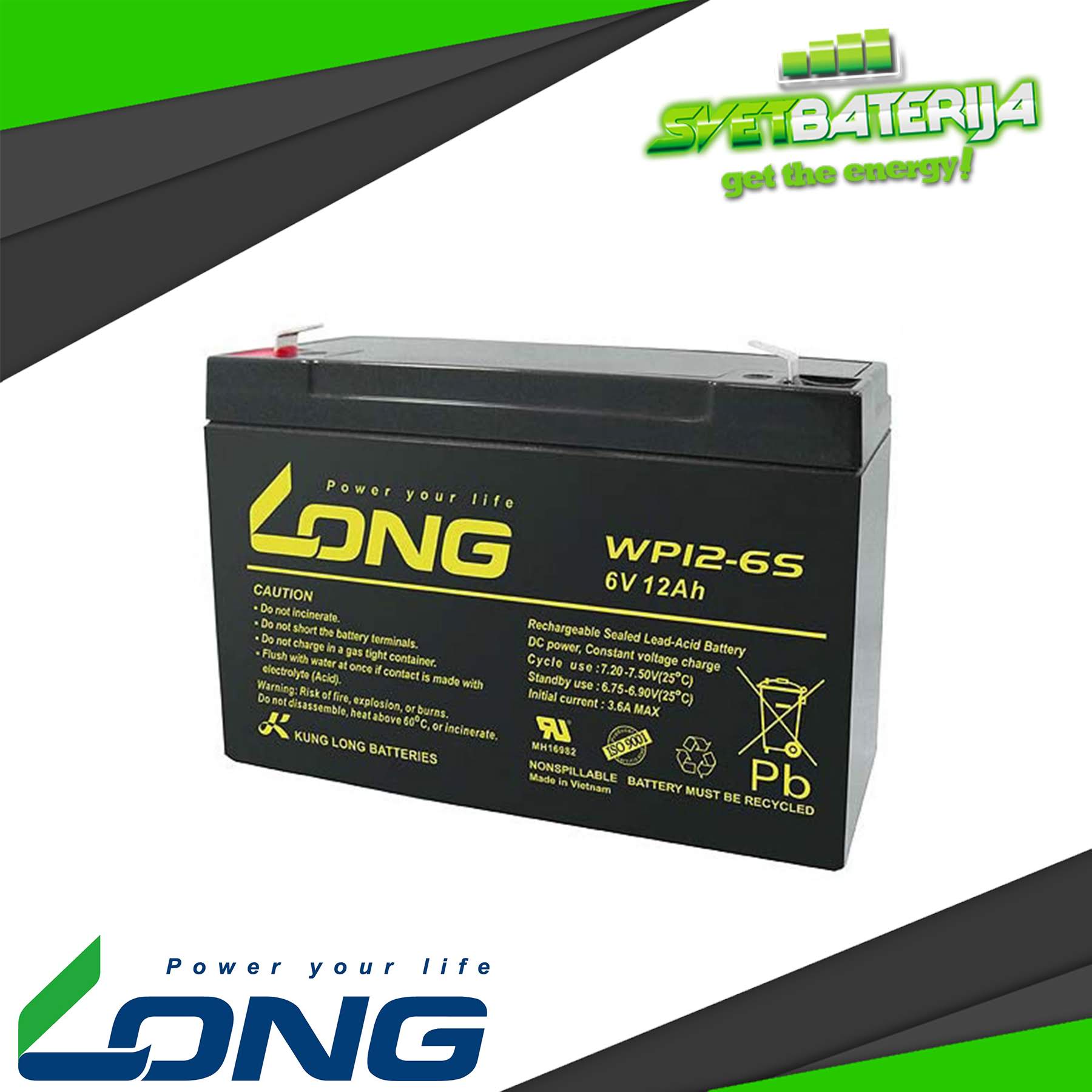 Kompanija Kung Long Batteries poreklom sa Tajvana se bavi proizvodnjom i prodajom olovnih baterija. Njihovi proizvodi obuhvataju AGM i Gel baterije, kao i druge tipove duboko cikličnih baterija. Long baterija 6V 12Ah pod oznakom WP12-6S je specijalna baterija dimenzija 151x54x94 (99 totalna visina) mm, koja za razliku od drugih baterija ovog napona i kapaciteta može da obezbedi veće struje pražnjenja.Ova baterija obezbeđuje i dug životni vek u uređajima kao što su dečiji automobili, alarmne centrale, čobanice (pastirice), dečije igračke, prskalice, kosačice, lampe i druge uređaje gde se traži suva baterija sličnih dimenzija ili karakteristika.