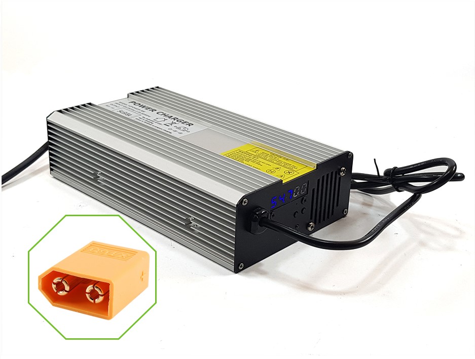 54.6V Punjač Li-Ion Baterija sa rasponom struje od 2A do 8A, ručno podešavanje struje punjenja. Odličan za servise električni bicikli, skuter, trotinet i drugih sličnih električnih vozila. Zaštita od pregrevanja ugrađen aktivni kuler za hlađenje komponenti, zaštita od prepunjavanja tj punjenje sa CC/CV krivom, zaštita od kratkog spoja. LED indikacija za status punjenja, sija crveno kada puni a zeleno kada je puno, ukoliko zasija odmah zeleno po spajanju punjača sa baterijom onda postoji mogućnost da je baterij skroz puna ili da je pala ispod dozvoljenog min. napona što je za 13S serijsku veziju 39V u tom slučaju mora ići na regeneraciju (za više informacija poslati poruku na KP ili pozvati).