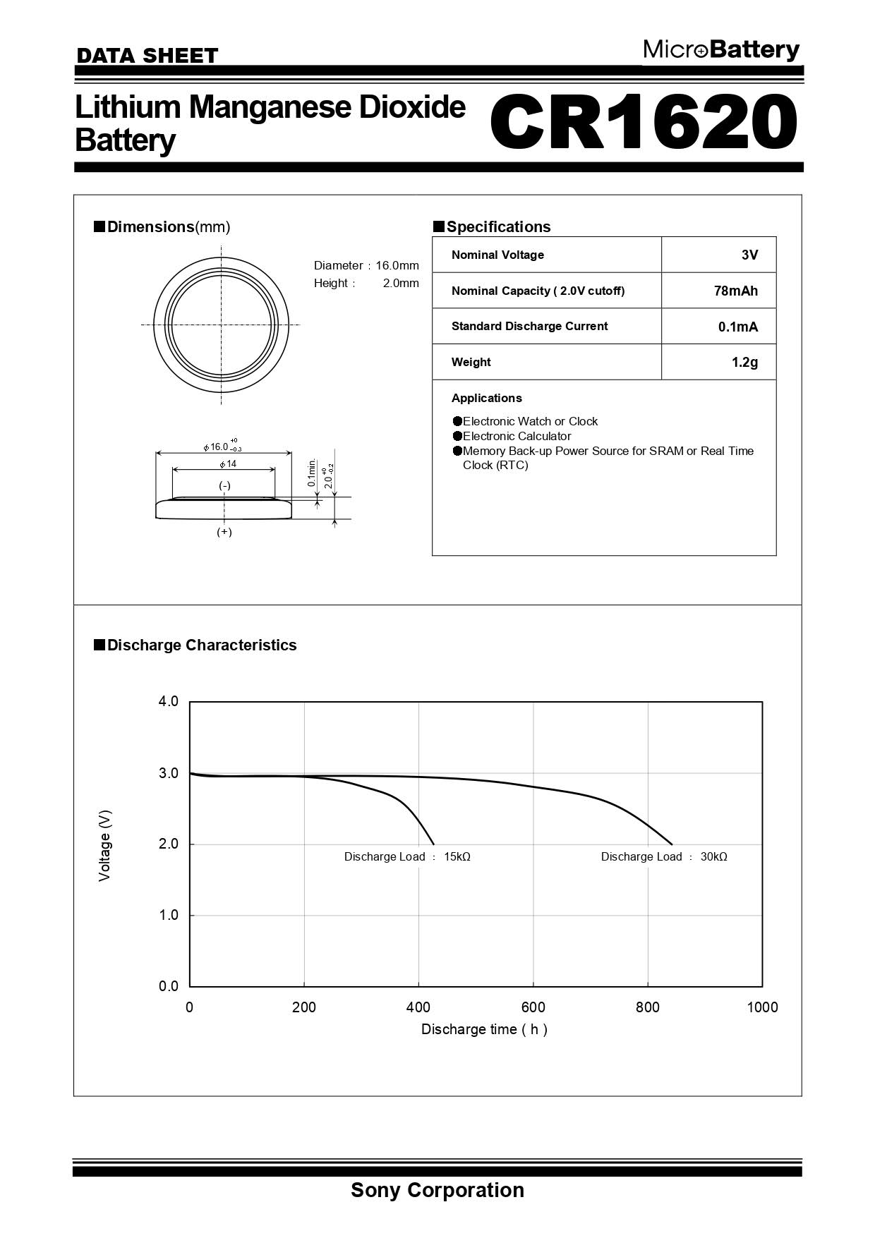 SONY CR1620 baterija stabilnog napona, jedinstvene tehnologije proizvodnje koja omogućava visoki napon i trajnost baterije. Vema pouzdane baterije namenjena za svakodnevnu upotrebu u uređajima, kao što su: digitron, ključ za kola, daljinski za kola, vaga, daljinski upravljači, itd.